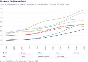 The 2020s is the decade during which the challenge of an ageing population shifts from being tomorrow’s problem to today’s. In many countries, falling birth rates and rising longevity have raised the average age of populations. As a result, there is an increase in what economists call the dependency ratio – indicating the proportion dependent on the working age population. Most advanced economies and many emerging ones will see their dependency ratio increase over the next decade.